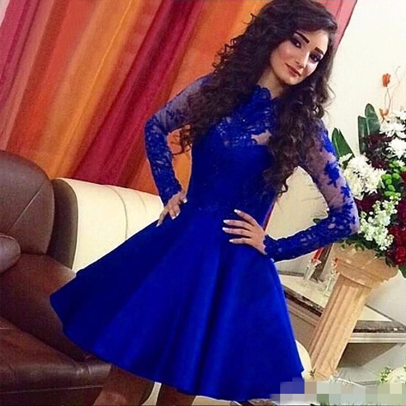 Simple Royal Blue Lace Short Homecoming Dresses Long Sleeve Semi Formal Dress For 8 Long Sleeve Homecoming Dresses Hoco Dresses Royal Blue Homecoming Dresses